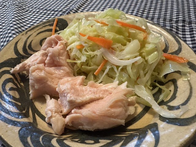 ずーっと作ってるキャベツの押しサラダとサラダチキン。