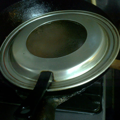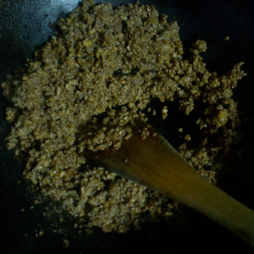 油を捨てて、シーニングを混ぜ、お水200ccを入れ、蒸らします。