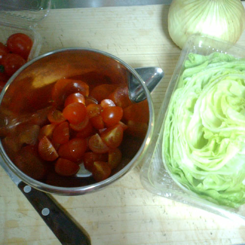 温まったら、トルティーヤにレタス+お肉+玉ねぎ+トマトを挟んで