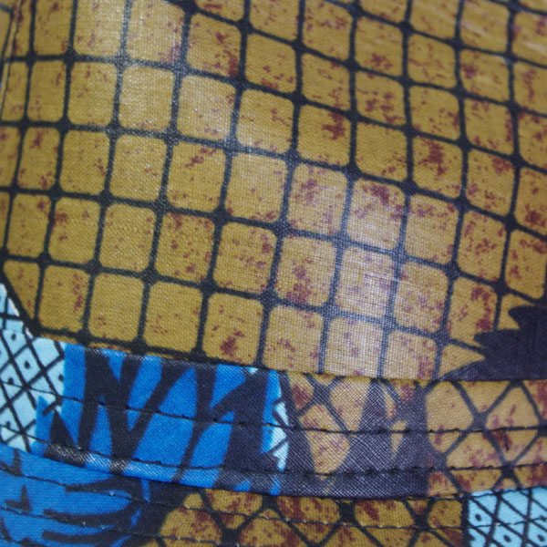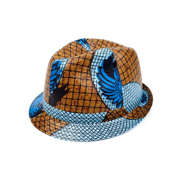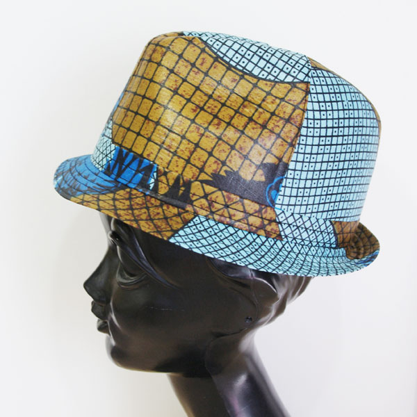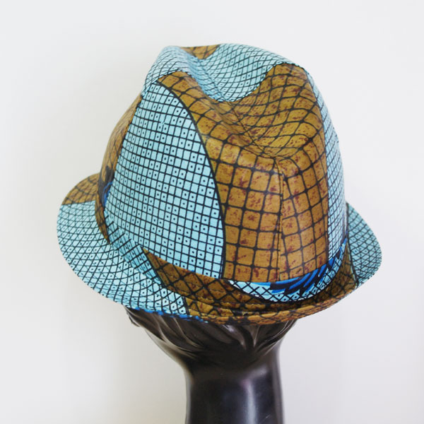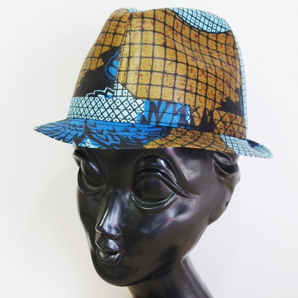 ブルー×茶色のアフリカンバティックの中折れ帽子です。