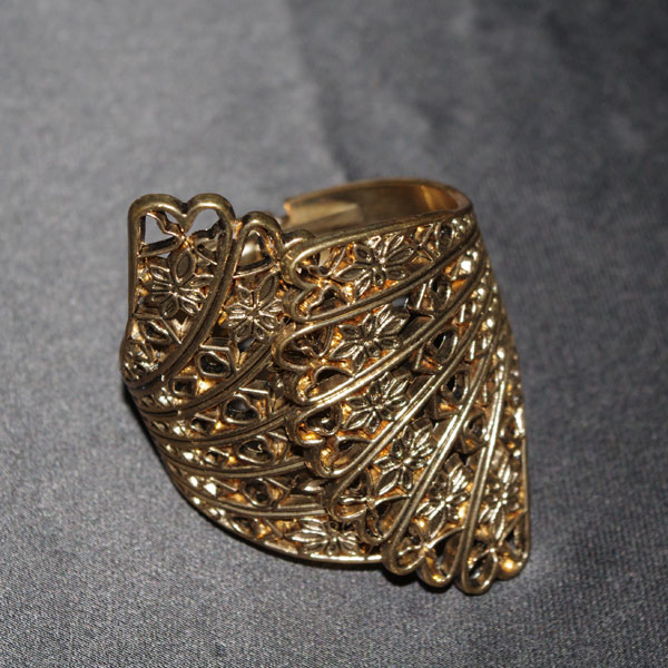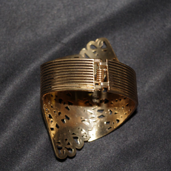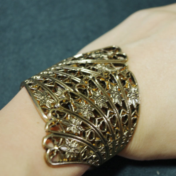 - 詳細 : 落ち着いた色目のゴールドのカットアウトのバングルです。正面で挟む形です。