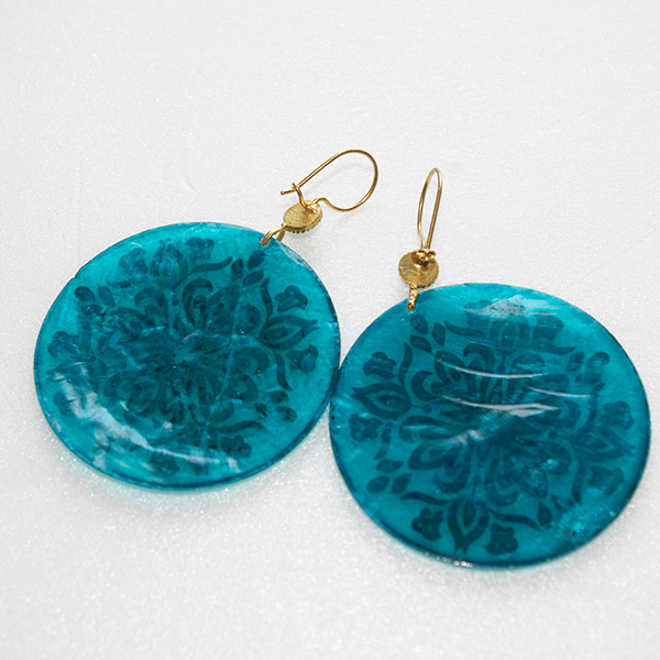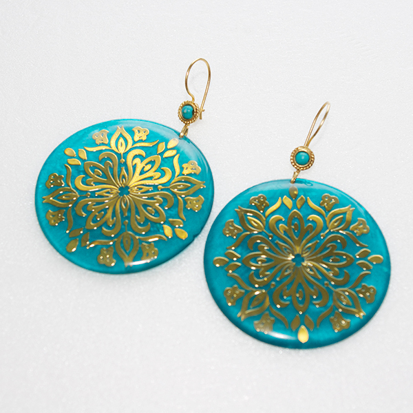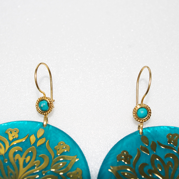 - 詳細 : ターコイズブルーのシェルにアラベスク模様が入ったピアスです。