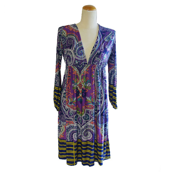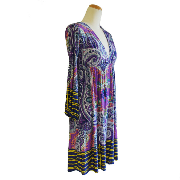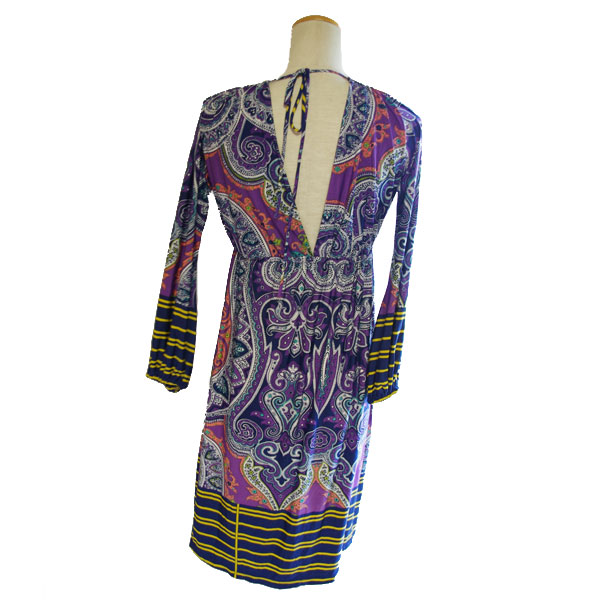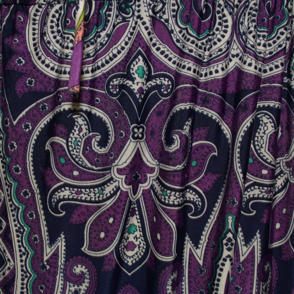 前も後ろも深いVネックです。パープルベースのペイズリー柄です。