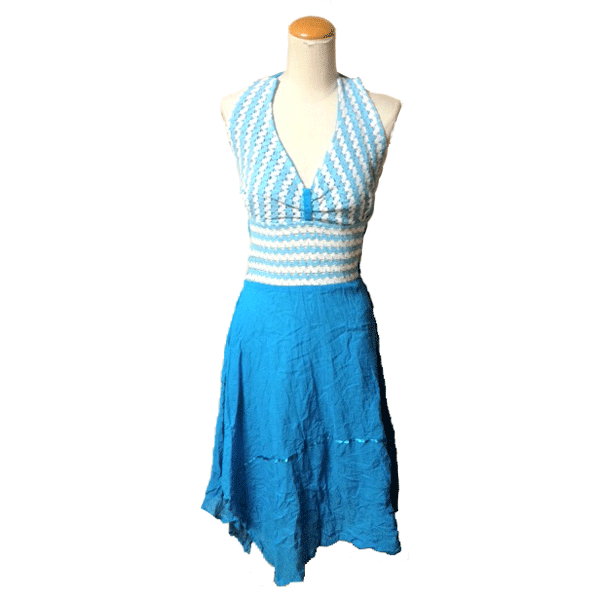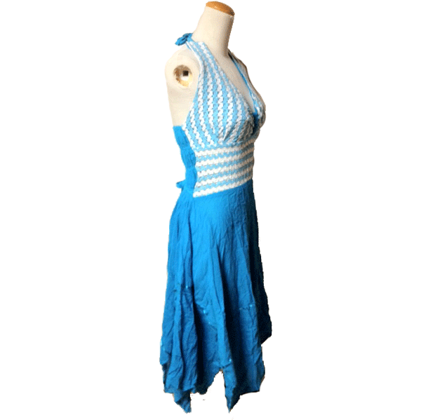• 詳細 : ヴィヴィットなアクアブルーのコットンマキシ丈ワンピースです。後ろはシャーリング、バックリボンです。前はボーダーのクロシェです。配色がレトロですね。ウエスト部分がクロシェの透かし編みになっています。