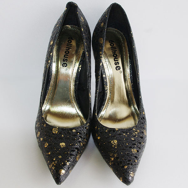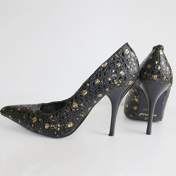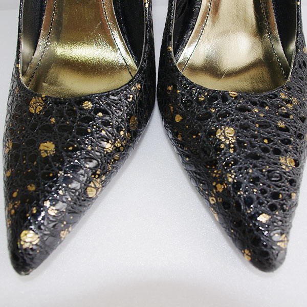 黒のクロコダイル型押しにゴールドが散りばめられていて、かっこいい印象のパンプスです。ヒールの高さも9cmで安定しています。シンプルに使えます。