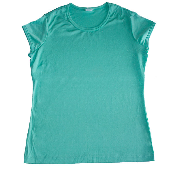 ナイロンの光沢あるTシャツです。エメラルドグリーンが春に向けて活躍しそうです。