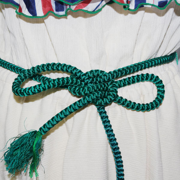 胸のフリルが3枚のスカーフで出来ています。帯が着物で使う帯紐です。