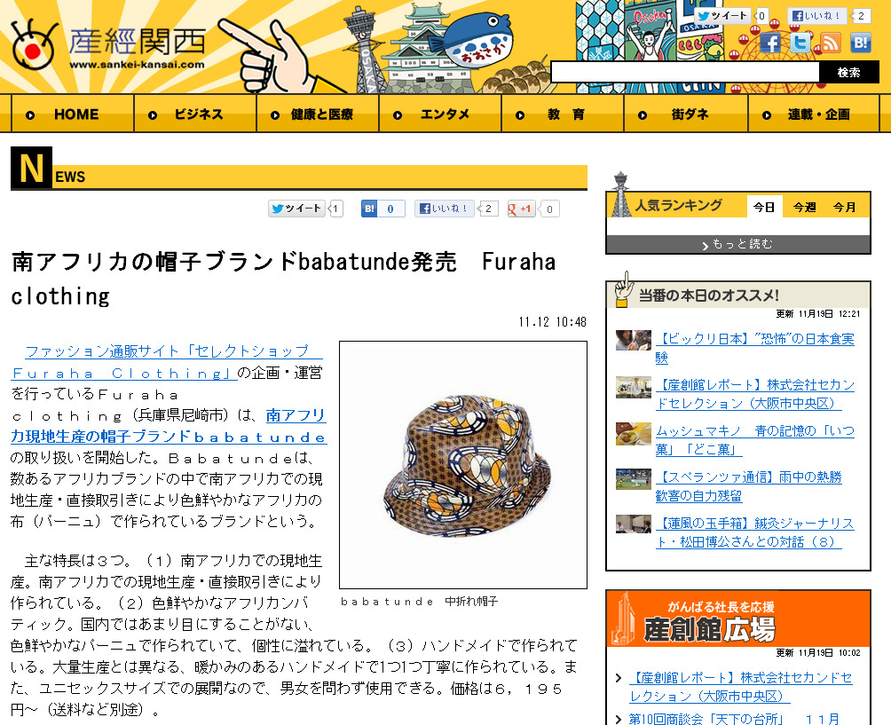 2012.11.12付けの産経新聞、大阪本社の公式HP、「産経関西」に掲載されています。