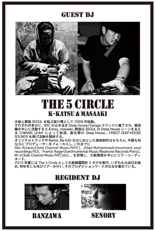 2010年夏にはThe 5 Circleとして大阪韓国間計5ギグを敢行、いずれも大成功を納め、同年冬にも再びツアーを行い、そのプロダクションワークが注目を集めている。