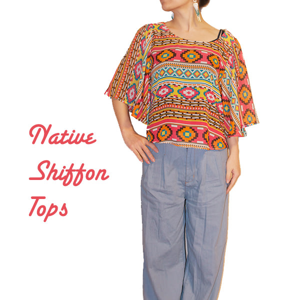ネイティブ柄シフォントップスでコーディネート! パステルカラーな上にシフォンで春らしいコーディネートです。 やっぱりパンツスタイルが合うかな。 お手持ちのデニムや細身のパンツでも合いそうです。