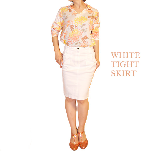 ホワイトデニムのストレッチタイトスカートのコーディネートです。 トップスも白ベースの花柄シャツに白でまとめてみました。 膝下丈のタイトスカートって落ち着いて見えますね! 柄の中に入っているオレンジでパンプスも差し色オレンジにしてみました。 今のシーズンから使えるコーディネートです。参考にどうぞ〜。