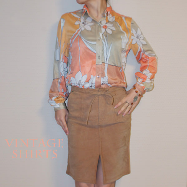 春だ!花柄だ!ブラウスだ!とヴィンテージ花柄シャツのコーディネートです。 パステルオレンジが物凄く優しい印象の1枚です。やっぱり、そんな1枚はスカートで 女っぷりを上げたいもんです。 落ち着いたブラウンのスエードスカートで更にやんわりした印象のコーディネートです。