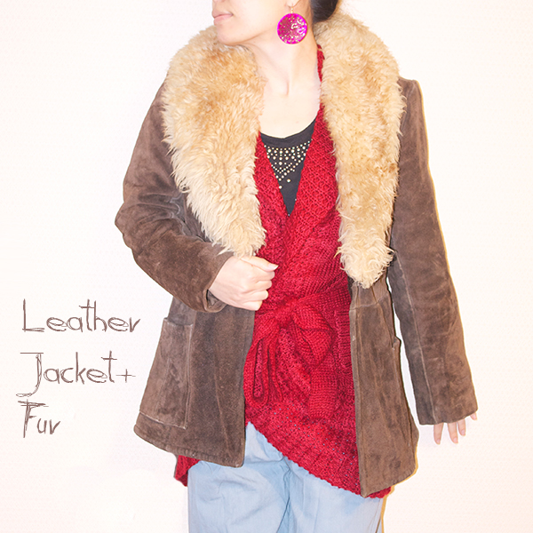ファー付レザージャケットでコーディネートを作ってみました! 赤のニットが差し色になって、重たい雰囲気を払拭してくれます。 お尻迄コートの丈がありますので、パンツの方が合いやすいかなと思います。 個人的にこのコーディネート好きです♩