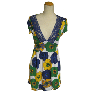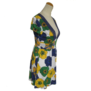 - 詳細 : 白地にイエローブルーグリーンのレトロなお花柄が映える花柄ワンピースです。